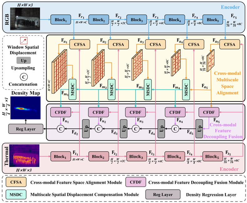 RGB与热红外(RGB-T)图像融合可有效缓解低光照场景下的信息缺失,但受不同成像设备异质性影响,现有方法仍面临两项关键挑战:其一,RGB与热红外图像之间存在空间错位,且多数RGB-T人群计数方法未能对该错位进行有效建模与校正,导致融合效果受限;其二,现有方法难以充分区分两种模态的特异特征与共性特征,造成冗余融合,进而削弱特征表征能力并影响计数精度。为此,提出跨模态空间对齐与融合网络CSAFNet。CSAFNet由跨模态特征空间对齐(CFSA)、多尺度空间位移补偿(MSDC)与跨模态特征解耦融合(CFDF)三部分组成:CFSA通过特征窗口实现精细空间对齐,并结合MSDC扩展至更大范围的空间一致性;CFDF引入KL散度与JS散度进行跨模态特征解耦融合,在保留模态特异细节的同时增强跨模态共性、抑制冗余信息并强化判别性表征。大量实验表明,CSAFNet在RGBT-CC与DroneRGBT数据集上取得了具有竞争力的性能,验证了其在跨模态人群计数任务中的有效性与应用潜力。研究成果受到国家自然科学基金资助。研究成果有望为畜禽夜间群体监测提供稳定支撑。