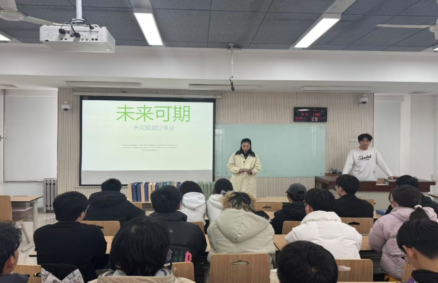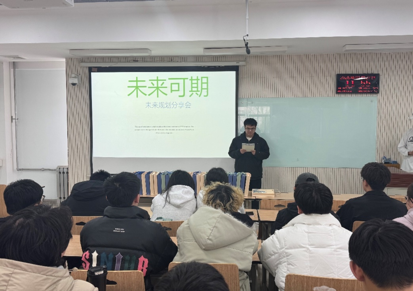 分享会上,氛围热烈而有序。丁子恒同学结合自身经历,围绕学业提升、目标设定等方面展开分享,他强调,未来规划并非一成不变的蓝图,而是在实践中不断调整、逐步明晰的过程,鼓励同学们立足当下,脚踏实地积累力量,不辜负每一段成长时光。田润同学则从自身对未来的探索出发,分享了在方向选择、困难应对中的经验与感悟,引导同学们正视自身优势,勇于尝试、敢于突破,在追逐梦想的道路上坚定前行。