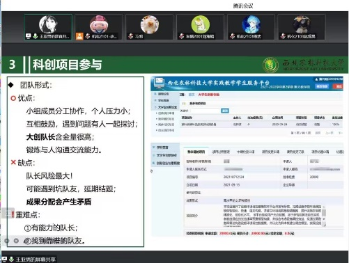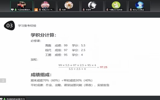 本次保研经验交流会有幸邀请到四位优秀的已保研的学长学姐们进行经验分享,他们分别是练家跃,王亚男,苟成林和马明。在本次保研经验交流会中,他们不止强调了保研对于学习方面的要求,还帮助同学们进行了竞赛时间线的梳理,使大家对每一场比赛都有更充分的准备,还有对于参与科创项目利弊的分析以及夏令营的准备,使参会的同学们受益匪浅。在保研经验交流会中,同学们的热情并没有因线上会议的距离感而减弱,他们积极向学长学姐们提出自己的疑惑,并都获得了学长学姐们的热心解答。
