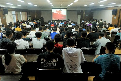大家统一观看了庆祝新中国成立70周年阅兵。军旗护卫方队、徒步方队、装甲方队和空中直升机编队及目不暇接的国产高科技武器装备方队等组成的受阅队伍在屏幕上相继亮相。铁甲奔涌,战机呼啸,导弹列阵,重器林立。他们整齐的步伐,严整的队容,饱满的精神,高昂的士气,立刻点燃了同学们的热情,“不禁为祖国的和平崛起和强盛感到兴奋和骄傲,也为自己属于这支充满爱国主义情怀的队伍中的一员而感到自豪。”现场不时地发出阵阵掌声和欢呼声,观看现场气氛热烈。先进的武器装备、英姿飒爽的军姿,感染着每一位团学干部。