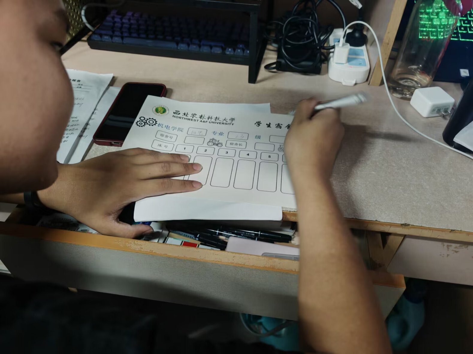 活动以宿舍为单位展开,同学们围绕主题,精心构思设计门贴。在设计过程中,大家充分发挥想象力,将宿舍号、所属专业班级以及各床位对应成员姓名巧妙地融入到门贴作品中,不仅体现了宿舍的独特标识,更展示出了机电学子的创新思维与团队协作精神。有的门贴采用了手绘风格,色彩鲜艳、形象生动;有的则运用电脑设计软件制作,排版精美、富有现代感;还有的结合了手工制作元素,如剪纸、贴纸等,增添了艺术质感与趣味性。