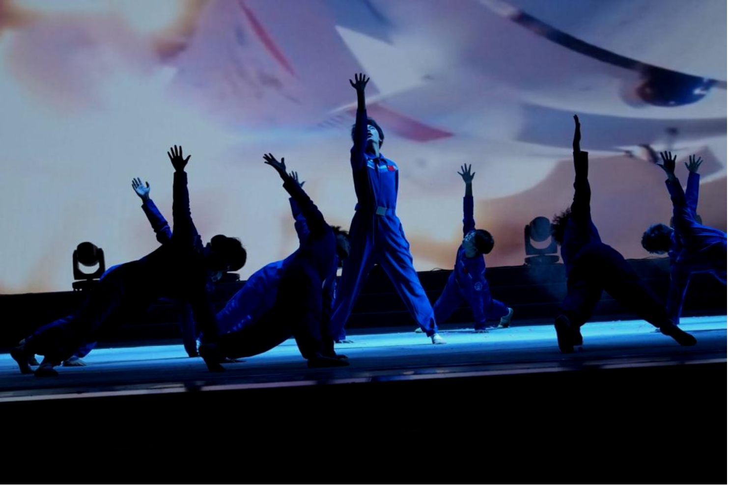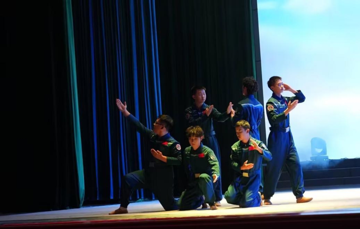《星火永相传》由机电成人影视片 部分男生联袂演绎,舞者们身着纯蓝色的航天主题演出服,以刚劲有力的肢体动作、层次丰富的队形变换,将中国航天从筚路蓝缕的创业之初,到星辰大海的探索征程生动呈现。从“两弹一星”的攻坚克难,到载人航天、月球探测、火星探测的接连突破,每一个舞蹈动作都紧扣航天发展的关键节点,伸展的手臂似托举航天梦飞向苍穹,俯身的姿态如扎根科研攻坚克难,展现出航天人不畏艰险、勇攀高峰的精神