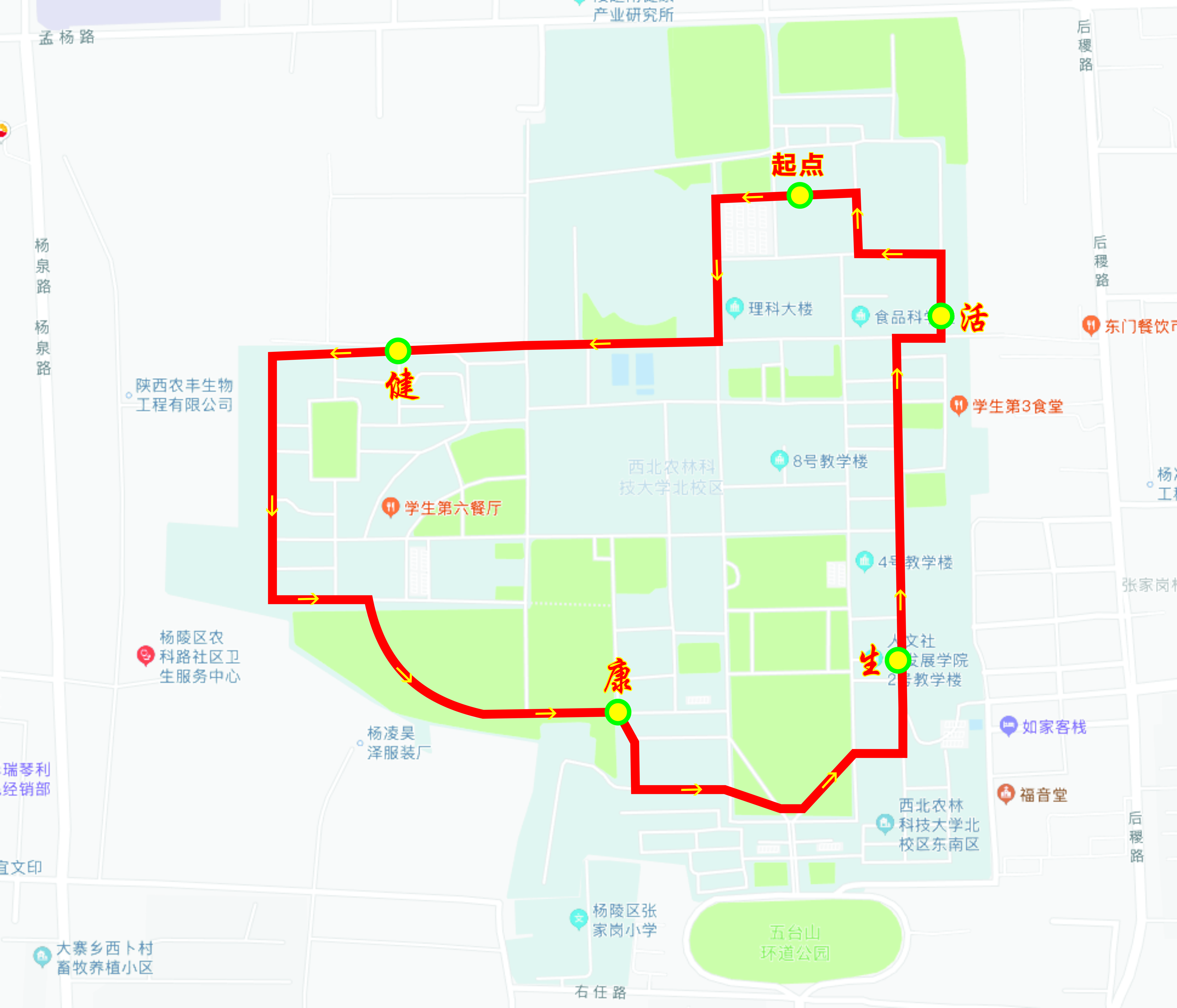 4.步行路线:从成人影视片 办公楼出发,经学生西区6号宿舍后,到西区澡堂,随后经过亦乐园,到达人文成人影视片 ,最后经过食品成人影视片 楼后返回成人影视片 。